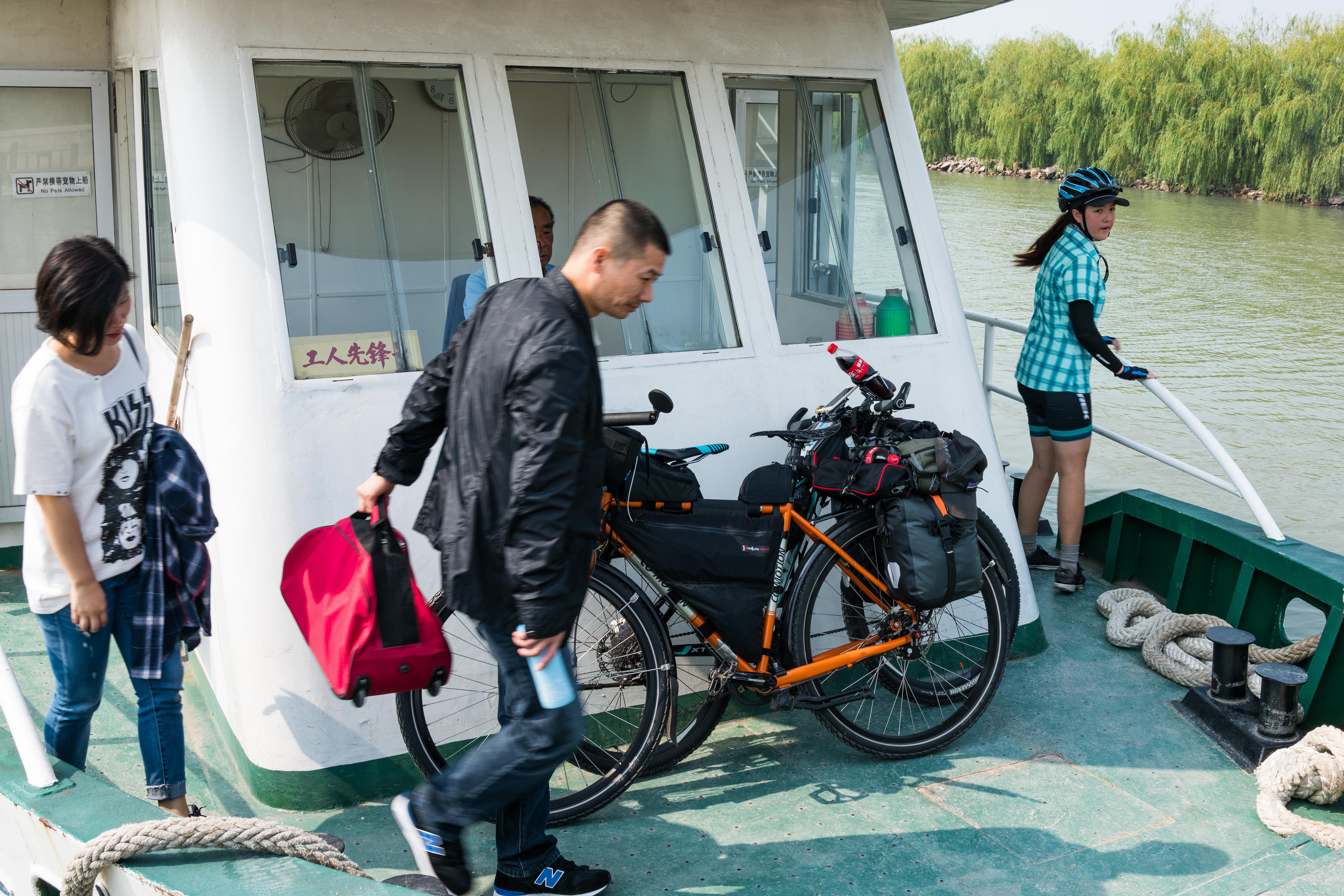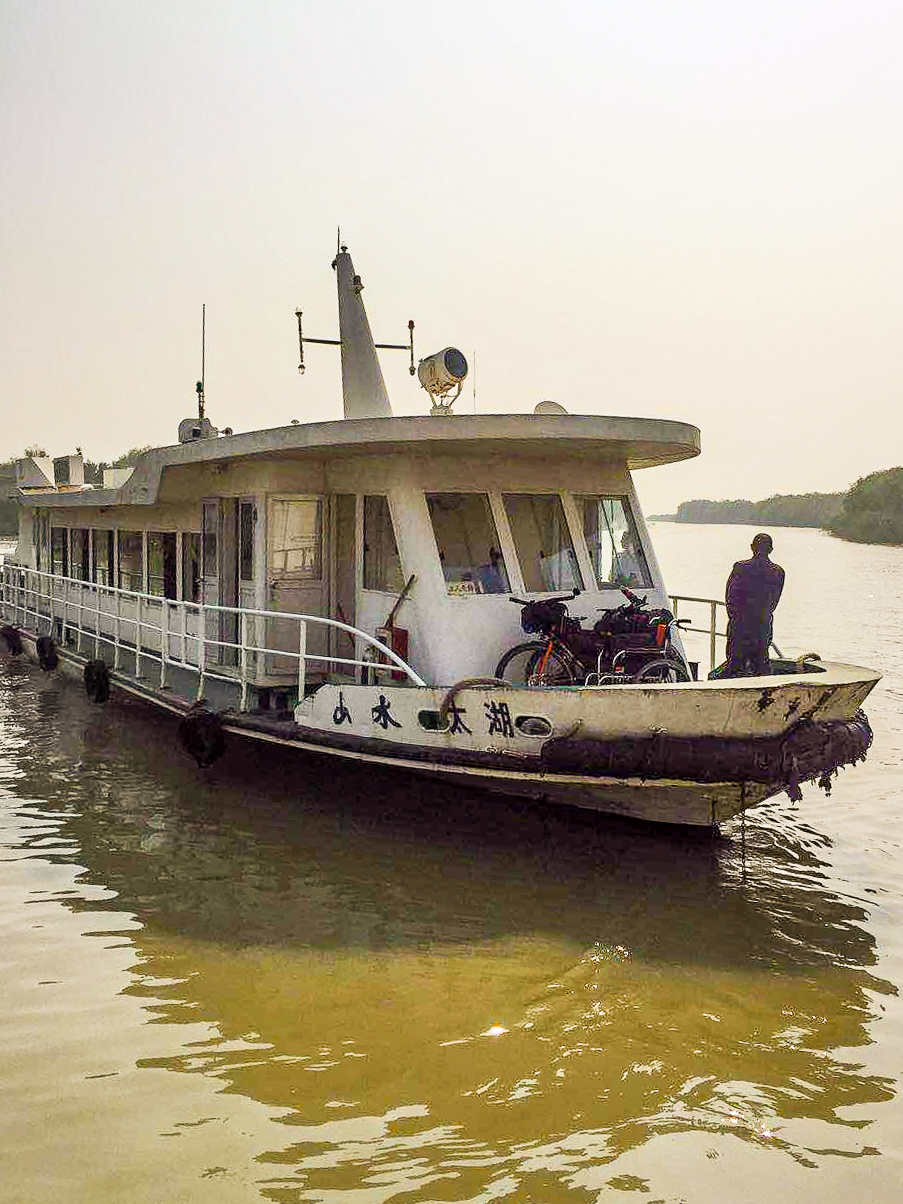 After reaching the ferry at around 4:30 in the afternoon, we bought our tickets and rolled the bikes aboard for a thirty-minute ride to Sanshan Dao. Keeping herself hydrated and fed throughout the day, Mia was still riding strong finishing up the 20 or 30 kilometers to the water’s edge of Tai Lake. The first leg of our journey was in the books.