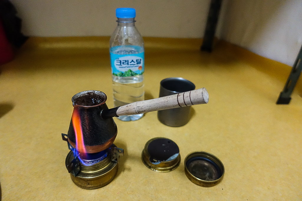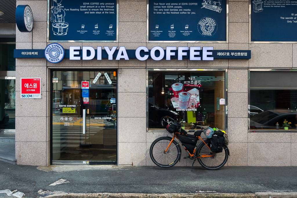 South Korea is replete with coffee shops of all sorts. Even the smallest bergs offer coffee of one type or another. I had no issues getting numerous cuppas along the way. Most shops opened about 9:00 am, so if I was hitting the road early, I just brewed myself a cup of Turkish coffee with my trusty little coffee kit before starting out.