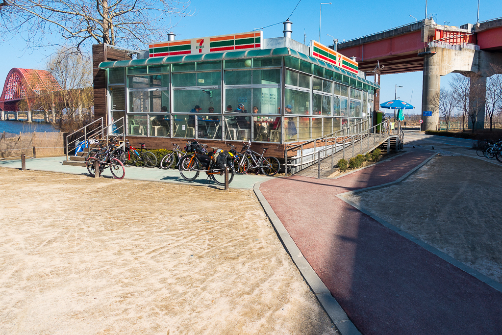 Mini 7-Eleven’s and other convenience stores can be found along all the bikeways, even a small restaurant or two, which serve as congregation points for cyclists to chat, drink coffee, and smoke cigarettes. Cycling clubs set up coffee stops and even little cycling shops in tents and utility vans with plenty of bike parts, clothing, and tools that cyclists can use along the routes. A few campgrounds are located along some of the routes, along with clean restrooms spaced out along the paths, especially near the cities. Unfortunately, the ones I passed along the Nakdonggang were all closed for the season.