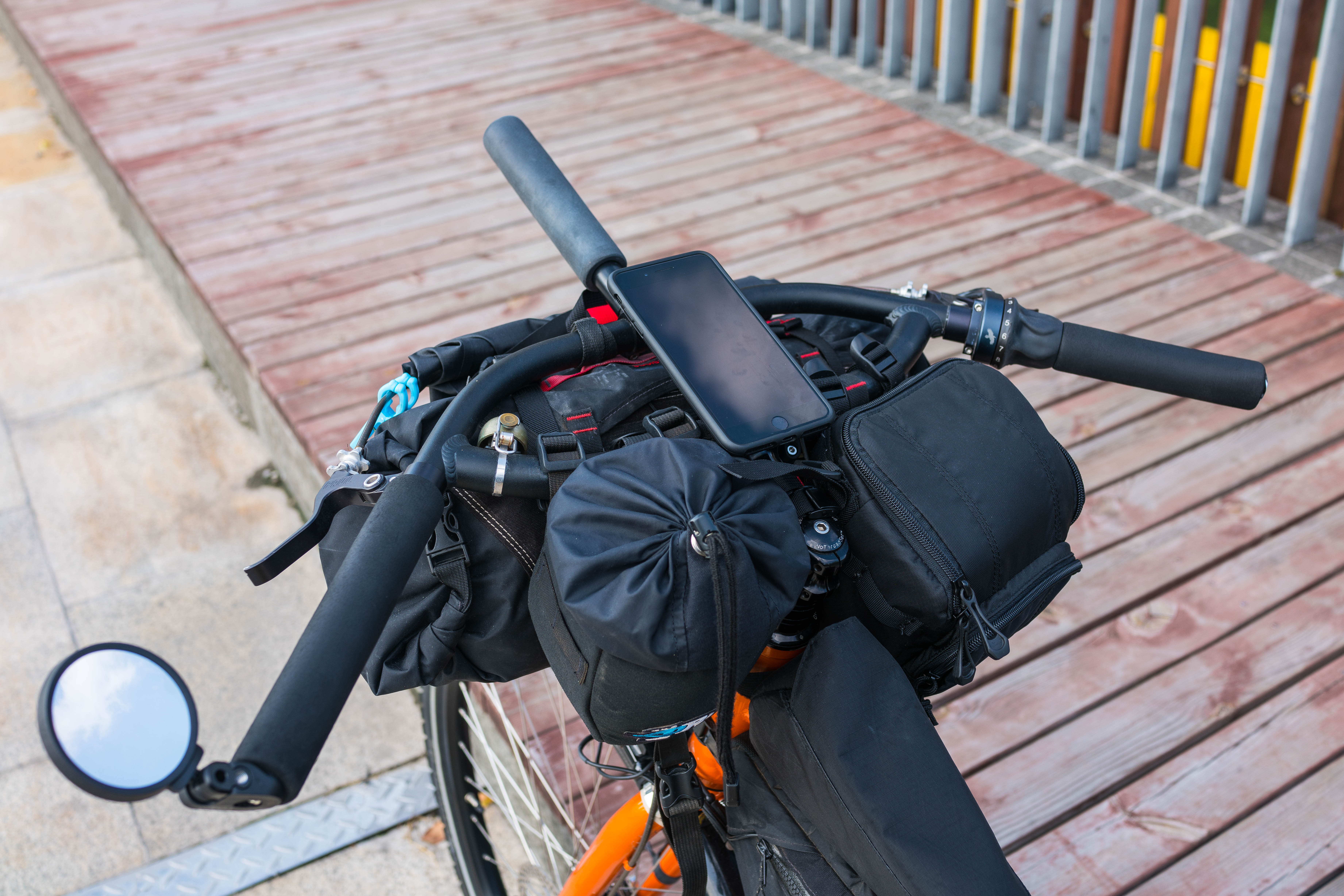 Quad-Lock smartphone mount. To better access my iPhone 7 Plus while riding, I installed Quadlock Out Front Mount on the Jones Loop H-Bar. The Quad Lock phone case includes a tight-fitting rain cover for when the wet stuff starts flying. Having the iPhone solidly mounted in front of me on the handlebar gives me quick access to GPS apps for navigation, especially when in big cities. It also communications at my finger tips for incoming messages and talking hands-free.