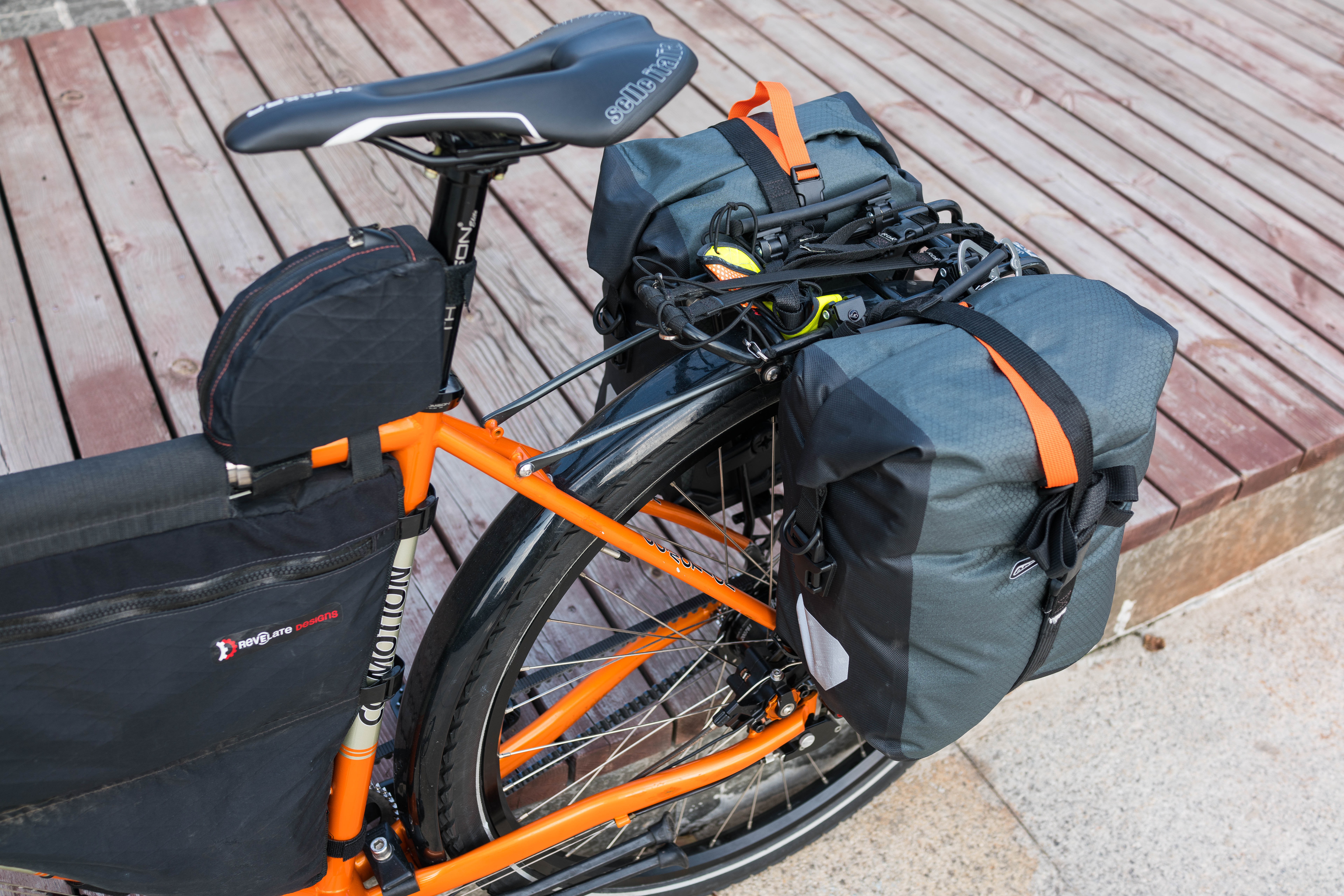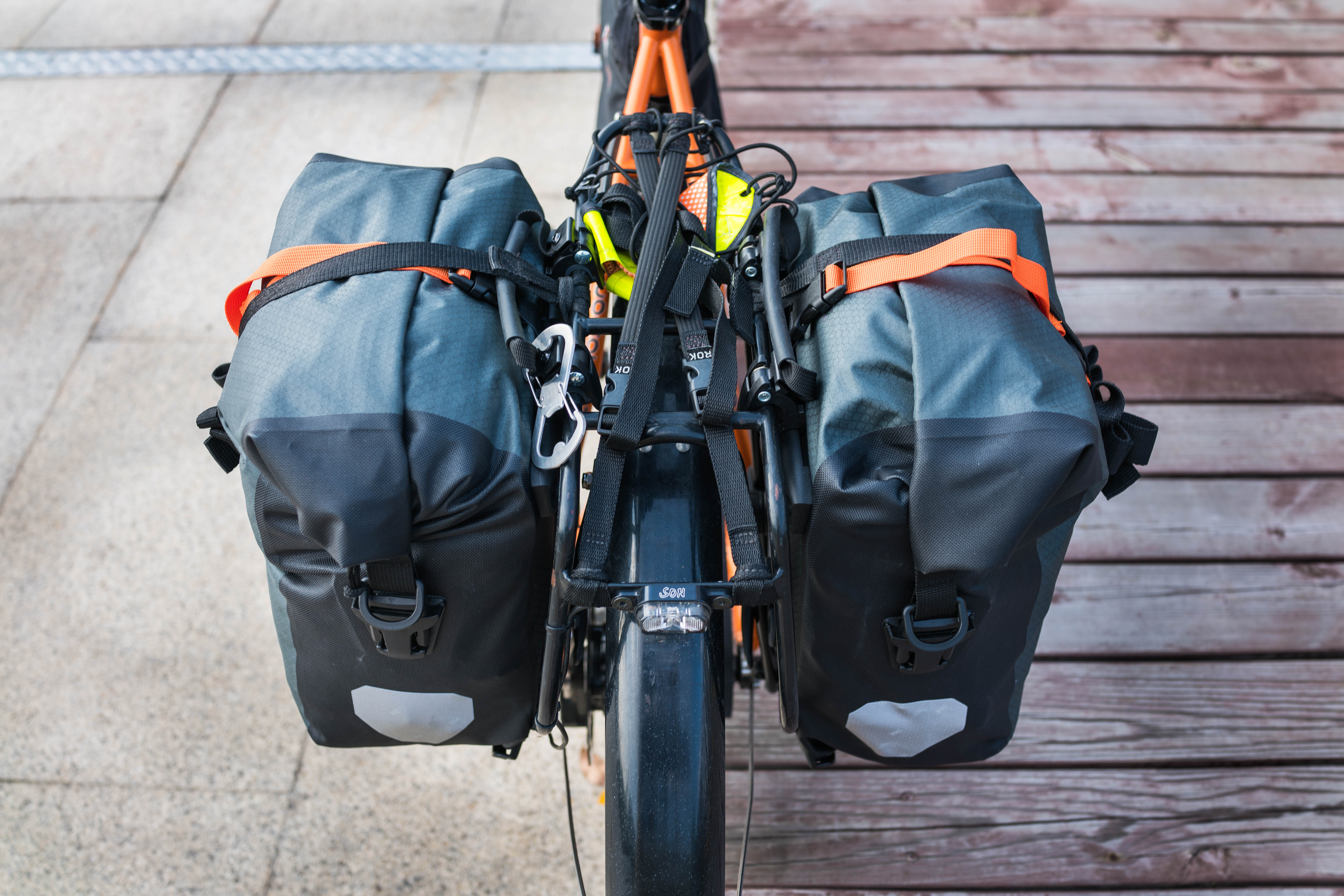 Ortlieb Gravel Packs. The front Ortlieb Roller Plus bags I used as rear panniers have found a new home on the rear rack of my wife’s bike, so I opted for a pair of Ortlieb’s new Gravel Packs. The new bags a little narrower but very similar to the Front Roller Plus panniers I’ve been running with, save for a simplified buckling arrangement. Double instead of single mounting hooks help keep the panniers more secure, especially when the bags are locked down with a pair of ROK Straps that eliminates vibration and rattling.
