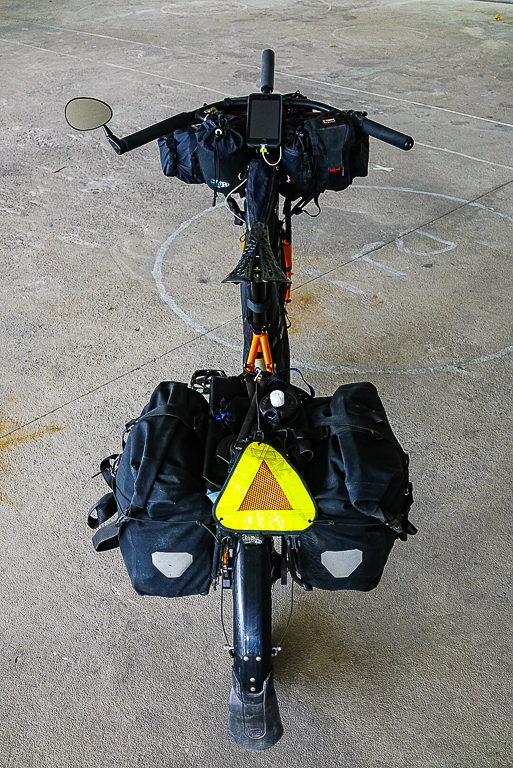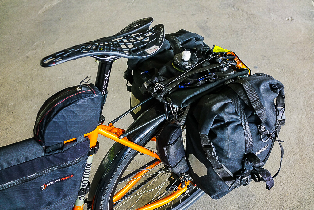 All of the kit fits in the two rear small panniers, the frame bag, handlebar bag, and accessory pouches. Top of the rear rack is free to haul food and water, and maybe a kangaroo or a dingo or two.